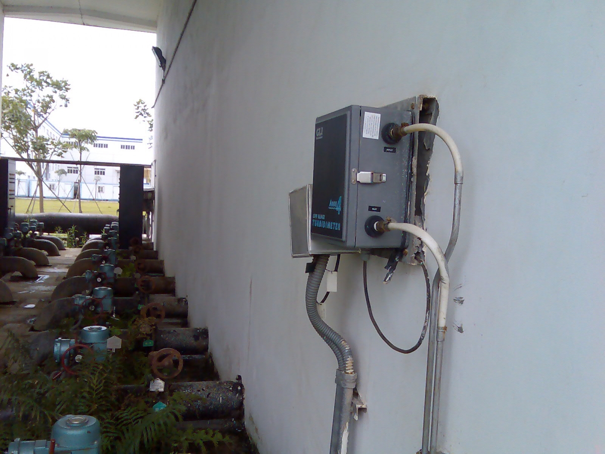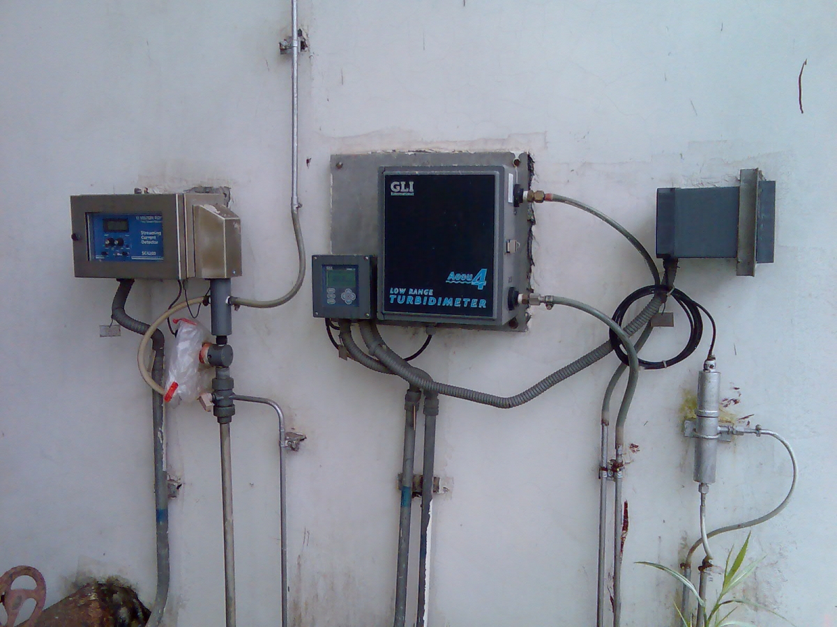 我廠凈水站整套設備由常州江南電力設備集團有限公司提供。由兩套機械石英砂過濾器和二氧化氯加藥設備制備生活用水、兩組沉淀池以及對應的絮凝劑和助凝劑加藥設備制備工業(yè)水組成。由于考慮到工業(yè)用水和生活用水對濁度的要求較高,機械石英砂過濾器出口濁度和沉淀池出口濁度,是生活水和工業(yè)水出水合格的標準,因此要求廠家提供測量穩(wěn)定可***的濁度計,通過與常州江南電力設備集團有限公司溝通協(xié)商選用由GLI Division of HACH CO.生產型號為8320T1A0C3NC測量裝置和型號為T53A4A2N二次儀表組成的濁度儀。