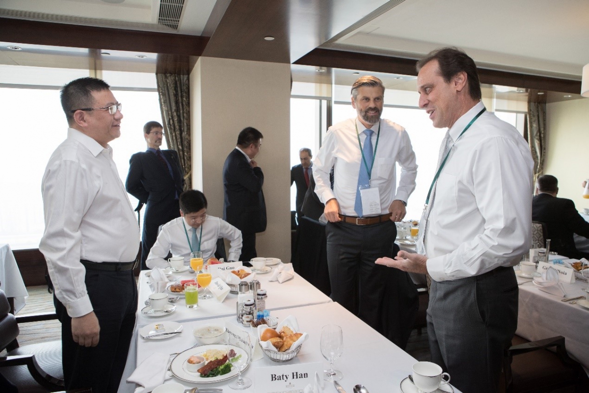 丹納赫水質(zhì)集團-大中華區(qū)銷售副總裁秦曉培(左一)與Greg DiNoia特潔安全球市政銷售副總裁(右一)及Torsten Hahr哈希全球產(chǎn)品事業(yè)部過程解決方案總監(jiān)(中)在交流會上